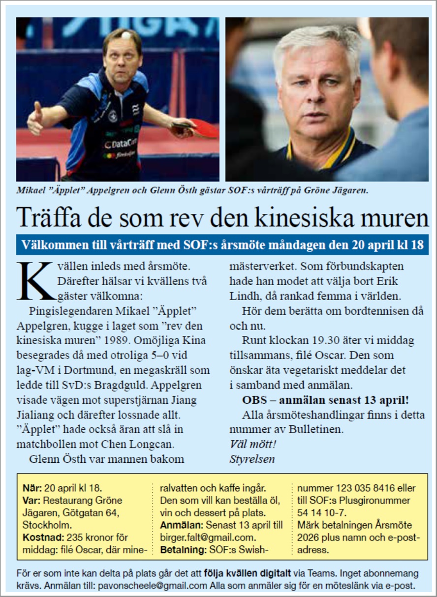 SOF årsmöte 20 april 2026 Gröne Jägaren, Götgatan 64, Stockholm kl 18-21